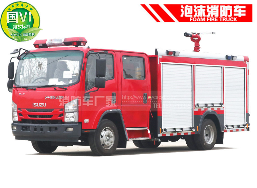 國六五十鈴3噸泡沫消防車,五十鈴120馬力國五發動機,底盤型號:QL1070BUKWY,發動機型號:4HK1CN6LB,7.00R16輪胎,紅色雙排駕駛室,軸距:3815mm。罐體容積:2噸水,1噸泡沫,配備上海茸申CB10/30消防泵,成都威斯特PS30消防炮,紅色警燈,整車消防紅。水射程:≥50m。