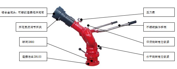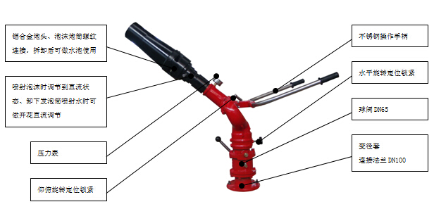 結構特點:泡沫炮主要由手把、底座、進水管、回轉體、鎖緊裝置、泡沫噴射系統及轉動機構組成,在8-10MPa的壓力范圍內具有良好的性能,它不但能噴射泡沫,又能噴射水。噴射空氣泡沫時,將比例混合器調整至與本炮的流量值后即可使用。